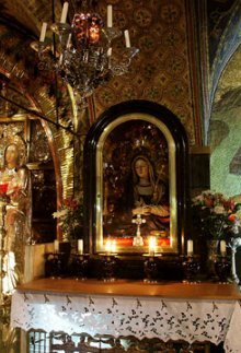 | The Latin Calvary chapel (below left) is said to be where Christ was nailed to the Cross. Between this and the Greek Calvary is an altar (below right), known as the Altar of Our Lady of Sorrows. It is considered by some to be the location of the Deposition, where the Virgin wept over the body of Christ. Not everyone agrees, though. To visit the alternative go back down the stairs and find the Stone of Unction. | |